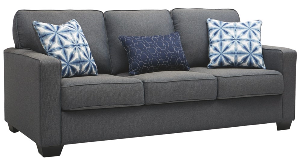Frame constructions have been rigorously tested to simulate the home and transportation environments for improved durability. Frame components are secured with combinations of glue, blocks, interlocking panels and staples. Seats and back spring rails are cut from mixed hardwood and engineered lumber. Stripes and patterns are match cut. All fabrics are pre-approved for wearability and durability against AHFA standards. Cushions are constructed of low melt fiber wrapped over high quality foam. Constructed with a platform seat foundation. Toss Pillows with welt. Kidney Pillow.