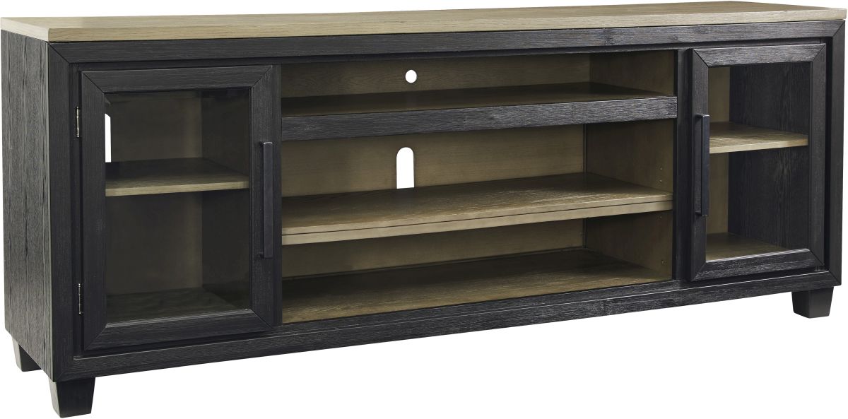 This TV stand with fireplace option is rustic, casual contemporary style simply done right. Its two-tone color scheme features a rich brushed black finish accented with a dusty grayish brown wood tone. With two glass-front cabinets (each with an adjustable shelf), an open cubby and a removable center shelf, it offers plenty of storage to house all of your electronic needs. Compatible with W100-12 electric LED fireplace insert (sold separately).Read More