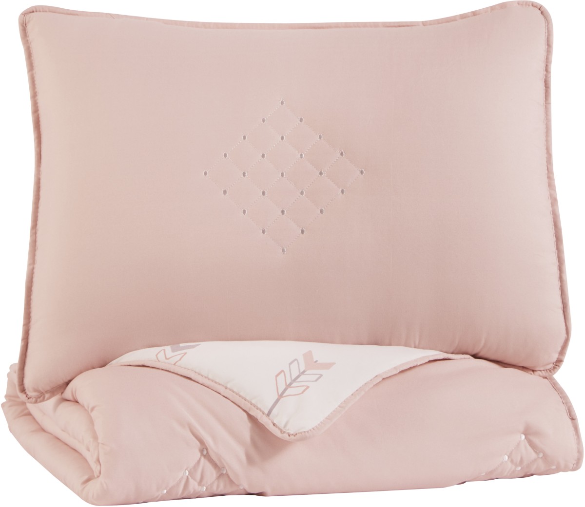 2-Piece comforter set - includes comforter and 1 sham. Solid in pink with white embroidered diamond design. Reverses to arrow design in pink, white and gray. Polyester microfiber cover with polyester filling. Machine washable.Read More